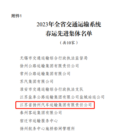 近日,省交通運輸廳下發(fā)的《關(guān)于表揚2023年全省交通運輸系統(tǒng)春運先進集體和個人的通報》,揚汽集團被授予“2023年全省交通運輸系統(tǒng)春運先進集體”榮譽稱號。